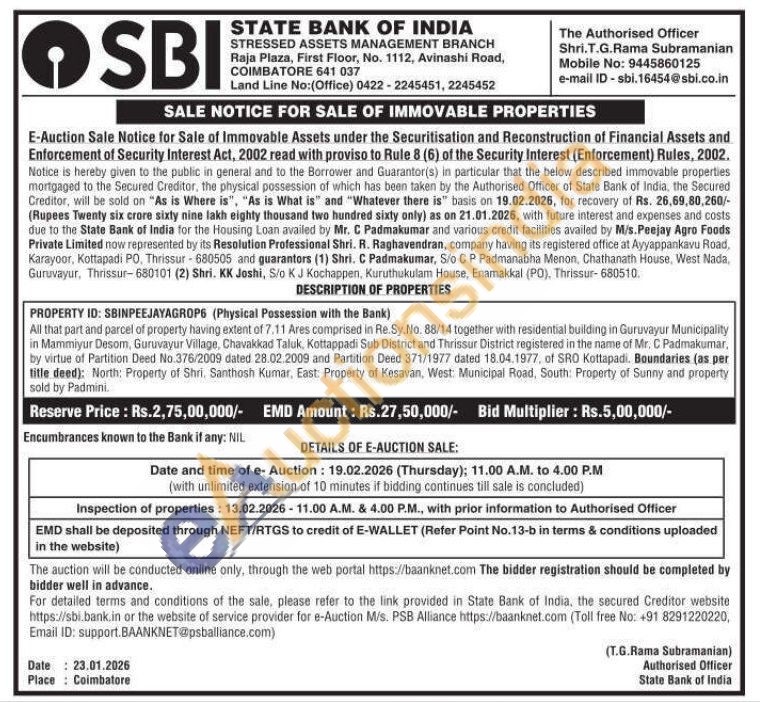 All that part and parcel of property having extent of 7.11 Ares comprised in Re.Sy. No. 88/14 together with residential building in Guruvayur Municipality in Mammiyur Desom, Guruvayur Village, Chavakkad Taluk, Kottappadi Sub District and Thrissur District registered in the name of Mr. C Padmakumar, by virtue of Partition Deed No.376/2009 dated 28.02.2009 and Partition Deed 371/1977 dated 18.04.1977, of SRO Kottapadi. Boundaries (as per title deed): North: Property of Shri. Santhosh Kumar, East: Property of Kesavan, West: Municipal Road, South: Property of Sunny and property sold by Padmini.