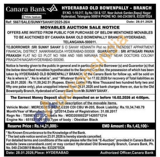 Vehicle Model: MERCEDES-BENZ C220 CDI CBU W-205, Book Liability: Rs. 10,34,740.79 Month/Year of Manufacturing: 12/2014, Date of Registration: 31.08.2017 Regn No: TS09EV2217, Chassis No: WDD2050022F1420571214 Engine No: 6519213261018, Type of body: Obsidian Black