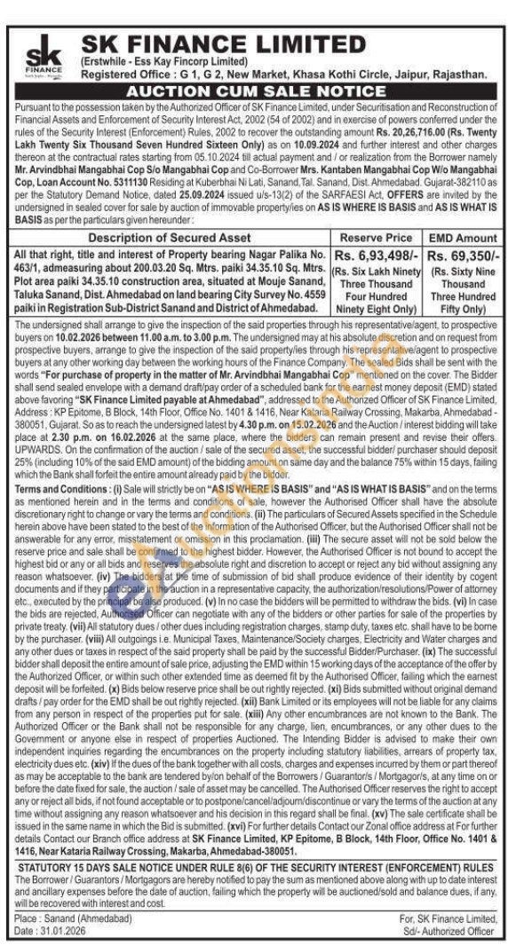 All that right, title and interest of Property bearing Nagar Palika No. 463/1, admeasuring about 200.03.20 Sq. Mtrs. paiki 34.35.10 Sq. Mtrs. Plot area paiki 34.35.10 construction area, situated at Mouje Sanand, Taluka Sanand, Dist. Ahmedabad on land bearing City Survey No. 4559 paiki in Registration Sub-District Sanand and District of Ahmedabad