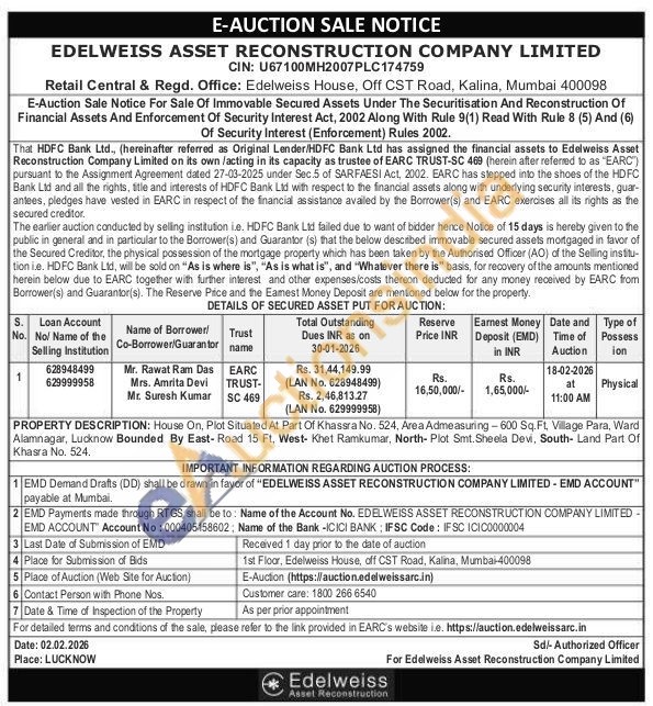 PROPERTY DESCRIPTION: House On, Plot Situated At Part Of Khassra No. 524, Area Admeasuring-600 Sq. Ft, Village Para, Ward Alamnagar, Lucknow Bounded By East-Road 15 Ft, West- Khet Ramkumar, North- Plot Smt. Sheela Devi, South- Land Part Of Khasra No. 524.