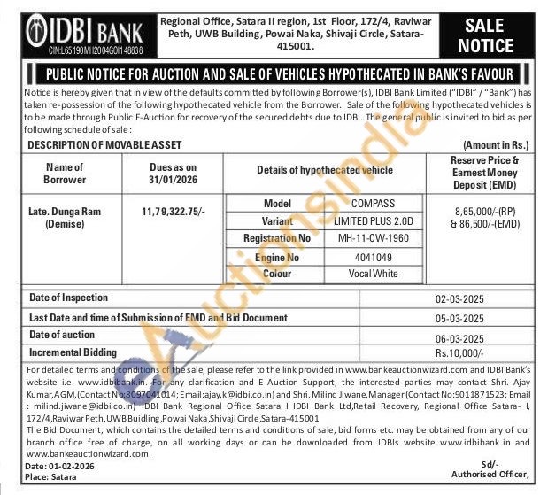 Model COMPASS Variant LIMITED PLUS2.00 Registration No MH-11-CW-1960 Engine No 4041049 Colour Vocal White
