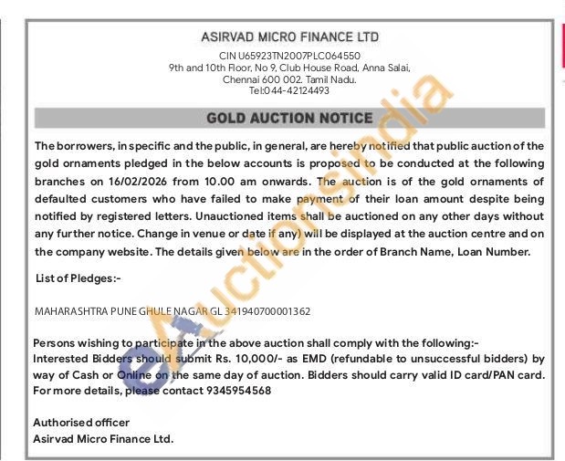 Asirvad Micro Finance Ltd Gold Auctions Auction in Chennai