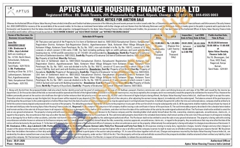 All That piece and parcel of the Property in (1st item of Settlement deed no. 5807/2022) Kanyakumari District, Kanyakumari Registration District, Kottaram Sub-Registration District, Agastheeswaram Taluk, Kottaram West Village Bifurgate from Kottaram Village, Kottaram Town Panchayat, Re. Sy. No. 169/1, now sub divided in to Re. Sy. No. 169/1C, consist of 12 aers consists in which consist 3.166 cents (1380 Sq. feet) including pathway right on width pathway and Land with Building bearing door rno. no. 4/104 and EB connection no. 07-143-001-28 and bounded by, Boundaries: North By: Property of Sivakumar 2nd item of Settlement deed no. 5807/2022, South By: Property of Sivakumar 3rd item of Settlement deed no. 5807/2022, East By: Property of Uyil Bred, West By: Pathway. (2nd item of Settlement deed no. 5807/2022) Kanyakumari District, Kanyakuamri Registration District, Kottaram Sub-Registration District, Agastheeswaram Taluk, Kottaram West Village Bifurgate from Kottaram Village, Kottaram Town. Panchayat, Re. Sy. No. 169/1, now sub divided in to Re. Sy. No. 169/1C, consist of 12 aers consists in which consist 3.166 cents (1380 Sq. feet) and Land with Building bounded by:- Boundaries: East By: Property of Uyil Bred, West By: Property of Ayyadurai, North By: Property of Rengaswamy, South By: Property of Sivakuamr 1st item of Settlement deed no. 5807/2022, (3rd item of Settlement deed no. 5807/2022) Kanyakumari District, Kanyakumari Registration District, Kottaram Sub-Registration District, Agastheeswaram Taluk, Kottaram West Village Bifurgate from Kottaram Village, Kottaram Town Panchayat, Re. Sy. No. 169/1, now sub divided in to Re. Sy. No. 169/10, consist of 12 aers consists in which consist 1 cents (435.6 Sq.feet) and Land with Building bounded by:- Boundaries: East By: Property of Uyil Bred, West By: Property of Chella Durai, North By: Property of Ayya Durai, South By: Property of Sivakumar 1st item of Settlement deed no. 5807/2022