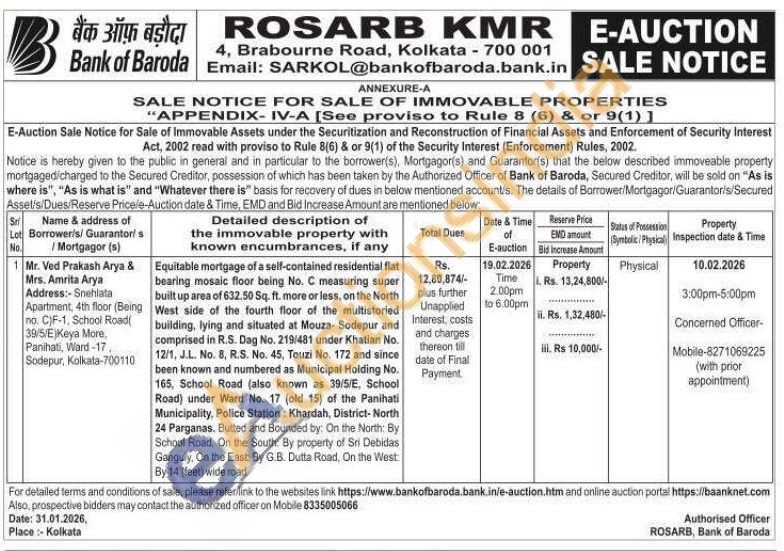 Equitable mortgage of a self-contained residential flat bearing mosaic floor being No. C measuring super built up area of 632.50 Sq. ft. more or less, on the North West side of the fourth floor of the multistoried building, lying and situated at Mouza- Sodepur and comprised in R.S. Dag No. 219/481 under Khatian No. 12/1, J.L. No. 8, R.S. No. 45, Touzi No. 172 and since been known and numbered as Municipal Holding No. 165, School Road (also known as 39/5/E, School Road) under Ward No. 17 (old 15) of the Panihati Municipality. Police Station: Khardah, District-North 24 Parganas. Butted and Bounded by: On the North: By School Road, On the South: By property of Sri Debidas Ganguly, On the East: By G.B. Dutta Road, On the West: By 14 (feet) wide road