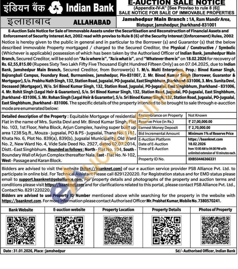 Detailed description of the Property: Equitable Mortgage of residential Flat in the name of Mrs. Sunita Devi and Mr. Binod Kumar Singh, Flat No. 103, 1st Floor, Neha Block, Arjun Complex, having super built up area 1238 Sq.ft., Mouza - Jugsalai, PO & PS - Jugsalai, Thana No. 1161, Khata No. 6, Plot No. 839(a), 839(b), Jugsalai Municipality, Old Ward No. 2, New Ward No. 4, Vide Sale Deed No. 2927, dated 02.07.2014, Distt.-East Singhbhum. Bounded as follows: North - Flat No. 104, South -Boundary Wall of Arjun Complex thereafter Nala, East - Flat No. N-102, West-Passage and Karan Block.