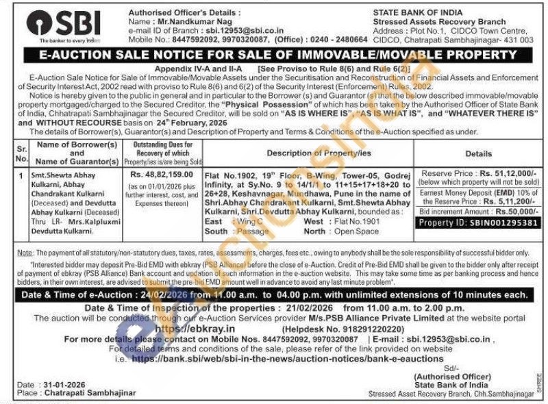 Flat No.1902, 19" Floor, B-Wing, Tower-05, Godrej Infinity, at Sy.No. 9 to 14/1/1 to 11+15+17+18+20 to 26+28, Keshavnagar, Mundhawa, Pune in the name of Shri. Abhay Chandrakant Kulkarni, Smt.Shewta Abhay Kulkarni, Shri.Devdutta Abhay Kulkarni, bounded as: East: Wing C West Flat No. 1901 South Passage North: Open Space
