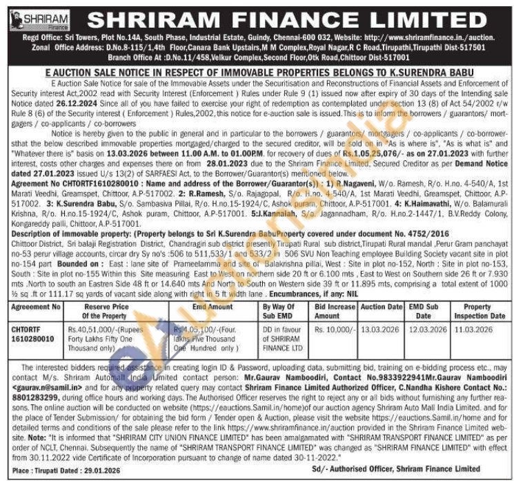 Chittoor District, Sri balaji Registration District, Chandragiri sub district presently Tirupati Rural sub district, Tirupati Rural mandal, Perur Gram panchayat no-53 perur village accounts, circar dry Sy no's :506 to 511,533/1 and 533/2 in 506 SVU Non Teaching employee Building Society vacant site in plot no-154 part Bounded on: East lane site of Prameelamma and site of Balakrishna pillai, West Site in plot no-152, North Site in plot no-153, South Site in plot no-155 Within this Site measuring East to West on northem side 20 ft or 6.100 mts, East to West on Southern side 26 ft or 7.930 mts North to south an Eastren Side 48 ft or 14.640 mts And North to South on Western side 39 ft or 11.895 mts, comprising a total extent of 1000 ½ sq.ft or 111.17 sq yards of vacant side along with right in 5 ft width lane. Encumbrances, if any: NIL
