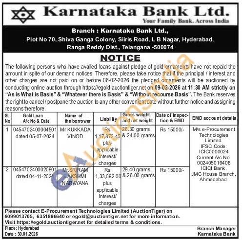 Karnataka Bank Gold Auctions Auction in Ahmedabad