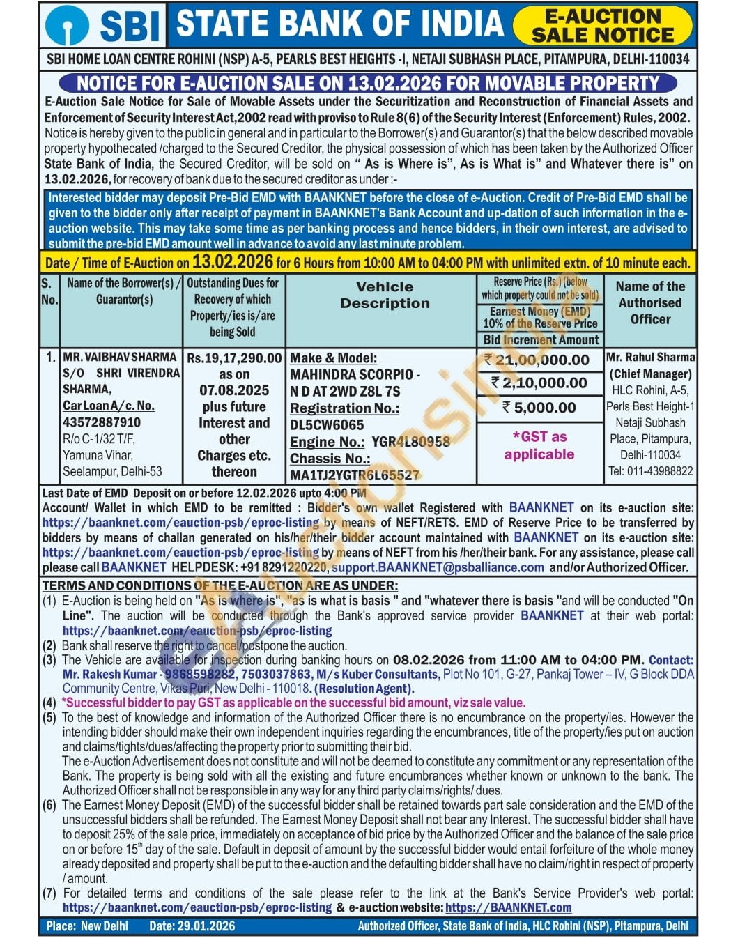 Make & Model: MAHINDRA SCORPIO -ND AT 2WD Z8L 7S Registration No.: DL5CW6065 Engine No.: YGR4L80958 Chassis No.: MA1TJ2YGTR6L65527