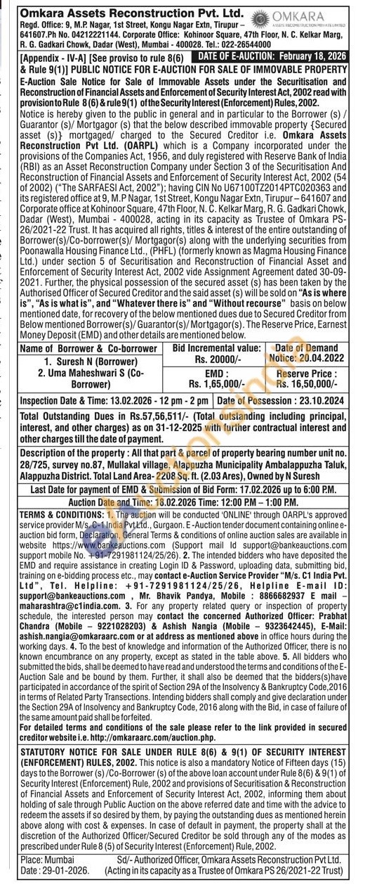 Description of the property: All that part & parcel of property bearing number unit no. 28/725, survey no.87, Mullakal village, Alappuzha Municipality Ambalappuzha Taluk, Alappuzha District. Total Land Area-2208 Sq. ft. (2.03 Ares), Owned by N Suresh