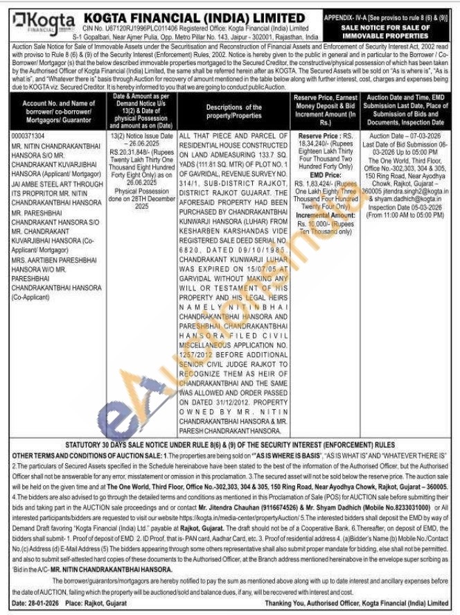 ALL THAT PIECE AND PARCEL OF RESIDENTIAL HOUSE CONSTRUCTED ON LAND ADMEASURING 133.7 SQ. YADS (111.81 SQ. MTR) OF PLOT NO. 1 OF GAVRIDAL, REVENUE SURVEY NO 314/1, SUB-DISTRICT RAJKOT, DISTRICT RAJKOT GUJARAT. THE AFORESAID PROPERTY HAD BEEN PURCHASED BY CHANDRAKANTBHA! KUNWARJI HANSORA (LUHAR) FROM KESHARBEN KARSHANDAS VIDE REGISTERED SALE DEED SERIAL NO 6820, DATED 09/10/1985 CHANDRAKANT KUNWARJI LUHAR WAS EXPIRED ON 15/07/05 AT GARVIDAL WITHOUT MAKING ANY WILL OR TESTAMENT OF HIS PROPERTY AND HIS LEGAL HEIRS NAMELY NITINBHAI CHANDRAKANTBHAI HANSORA AND PARESHBHAI CHANDRAKANTBHAI HANSORA FILED CIVIL MISCELLANEOUS APPLICATION NO 1257/2012 BEFORE ADDITIONAL SENIOR CIVIL JUDGE RAJKOT TO RECOGNIZE THEM AS HEIR OF CHANDRAKANTBHAI AND THE SAME WAS ALLOWED AND ORDER PASSED ON DATED 31/12/2012. PROPERTY OWNED BY MR. NITIN CHANDRAKANTBHAI HANSORA & MR. PARESH CHANDRAKANT HANSORA