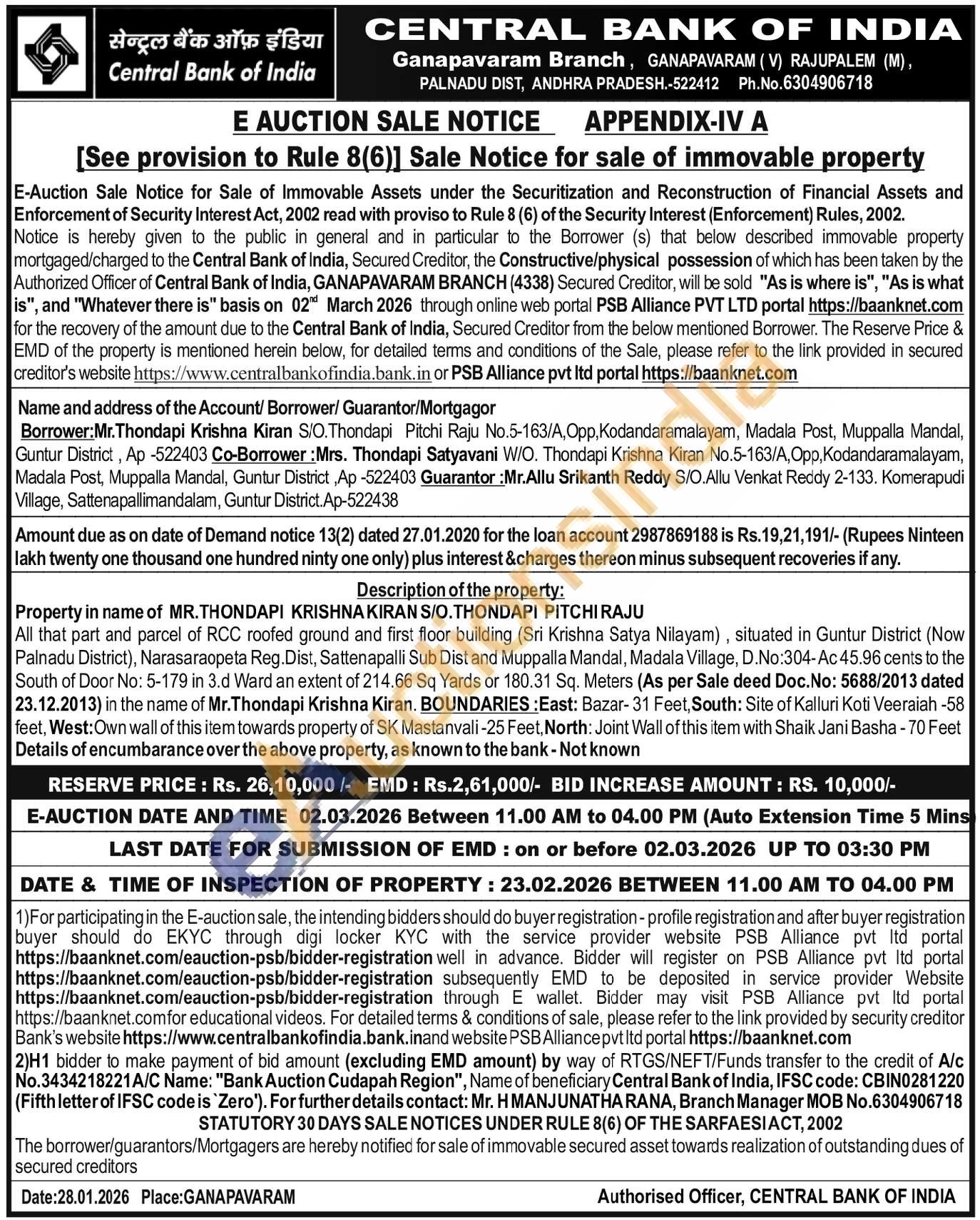 All that part and parcel of RCC roofed ground and first floor building (Sri Krishna Satya Nilayam), situated in Guntur District (Now Palnadu District), Narasaraopeta Reg. Dist, Sattenapalli Sub Dist and Muppalla Mandal, Madala Village, D.No:304-Ac 45.96 cents to the South of Door No: 5-179 in 3.d Ward an extent of 214.66 Sq Yards or 180.31 Sq. Meters (As per Sale deed Doc. No: 5688/2013 dated 23.12.2013) in the name of Mr. Thondapi Krishna Kiran. BOUNDARIES: East: Bazar-31 Feet, South: Site of Kalluri Koti Veeraiah -58 feet, West: Own wall of this item towards property of SK Mastanvali-25 Feet, North: Joint Wall of this item with Shaik Jani Basha - 70 Feet Details of encumbarance over the above property, as known to the bank - Not known