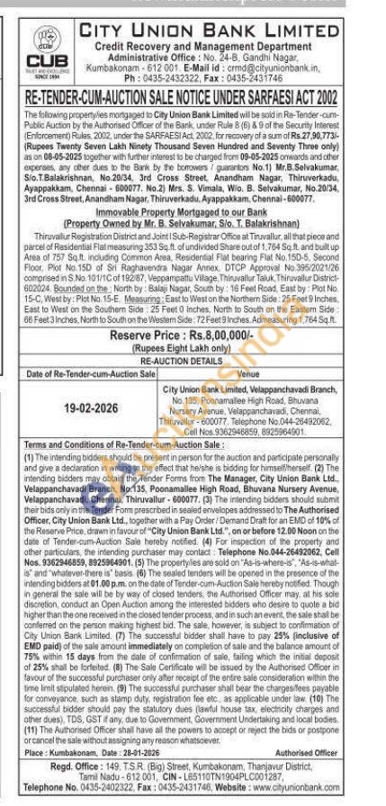 Thiruvallur Registration District and Joint I Sub-Registrar Office at Tiruvallur, all that piece and parcel of Residential Flal measuring 353 Sq. ft. of undivided Share out of 1.764 Sq. ft. and built up Area of 757 Sq.ft. including Common Area, Residential Flat bearing Flat No. 150-5. Second Floor, Plot No. 150 of Sri Raghavendra Nagar Annex, DTCP Approval No. 395/2021/26 comprised in S.No. 101/1C of 192/87, Vepparipattu Village, Thiruvallur Taluk, Thiruvallur District-602024, Bounded on the North by: Balaji Nagar, South by: 16 Feet Road, East by: Plot No 15-C. West by: Plot No. 15-E. Measuring: East to West on the Northem Side: 25 Feet 9 Inches, East to West on the Southern Side 25 Feet 0 Inches, North to South on the Eastern Side: 66 Feet 3 inches, North to South on the Westem Side. 72 Feet 9 Inches. Admeasuring 1.764 Sq.ft.