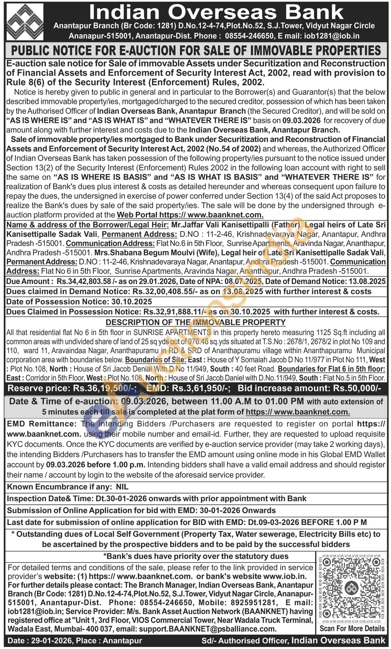 All that residential flat No 6 in 5th floor in SUNRISE APARTMENTS in this property hereto measuring 1125 Sq.ft including all common areas with undivided share of land of 25 sq yds out of 976.48 sq. yds situated at T.S.No: 2678/1, 2678/2 in plot No 109 and 110, ward 11, Aravaindaa Nagar, Ananthapuramu in RD & SRD of Ananthapuramu village within Ananthapuramu Municipal corporation area with boundaries below. Boundaries of Site: East: House of Y Somaiah Jacob D No 11/977 in Plot No 111, West : Plot No. 108, North: House of Sri Jacob Denial With D No 11/949, South: 40 feet Road. Boundaries for Flat 6 in 5th floor: East: Corridor in 5th Floor, West: Plot No. 108, North: House of Sri Jacob Daniel with D.No. 11/949, South: Flat No.5 in 5th Floor.