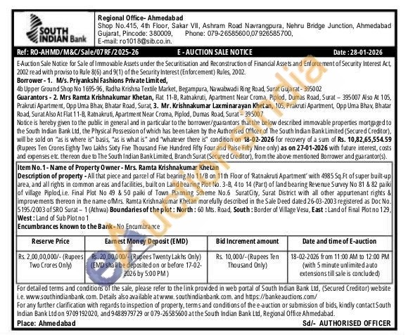 Description of property - All that piece and parcel of Flat bearing No 11/B on 11th Floor of Ratnakruti Apartment' with 4985 Sq.Ft of super built-up area, and all rights in common areas and facilities, built on Land bearing Plot No. 3-B, 4 to 14 (Part) of land bearing Revenue Survey No 81 & 82 paiki of village Piplod,i.e. Final Plot No 49 & 50 paiki of Town Planning Scheme No.6 Surat City, Surat District with all other appurtenant rights & improvements thereon in the name ofMrs. Ramta Krishnakumar Khetan morefully described in the Sale Deed dated 26-03-2003 registered as Doc No. 5195/2003 of SRO Surat-1 (Athwa) Boundaries of the plot: North: 60 Mts. Road, South: Border of Village Vesu, East: Land of Final Plotno 129, West: Land of Sub Plot no 1