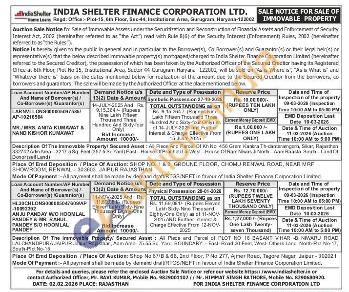 Description Of The Immovable Property/ Secured Asset: All Piece And Parcel Of Kh No. 456 Gram Kankra Th-dantaramgarh, Sikar, Rajasthan 332742 Adm Area-3217.5 Sq. Feet (357.5 Sq Yard) East-House Of Prabhati Lal West-House Of Ram Niwas Ji North-Aam Raasta South-Land Of Donor (self Land)