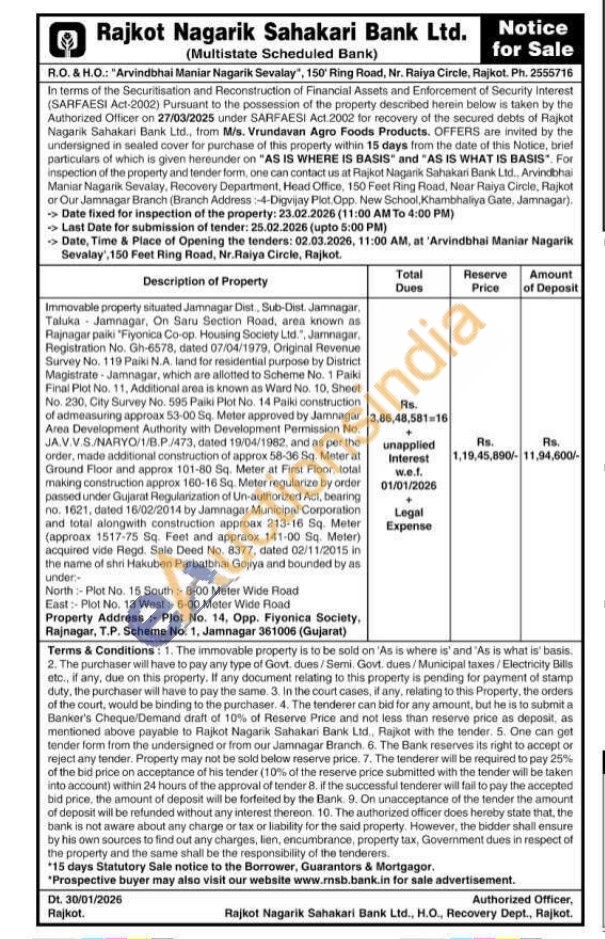 Immovable property situated Jamnagar Dist., Sub-Dist. Jamnagar, Taluka Jamnagar, On Saru Section Road, area known as Rajnagar paiki "Fiyonica Co-op. Housing Society Ltd.", Jamnagar, Registration No. Gh-6578, dated 07/04/1979, Original Revenue Survey No. 119 Paiki N.A. land for residential purpose by District Magistrate Jamnagar, which are allotted to Scheme No. 1 Paiki Final Plot No. 11, Additional area is known as Ward No. 10, Sheet No. 230. City Survey No. 595 Paiki Plot No. 14 Paiki construction of admeasuring approax 53-00 Sq. Meter approved by Jamnagar Area Development Authority with Development Permission No. JA.V.V.S/NARYO/1/B.P./473, dated 19/04/1982, and as per the order, made additional construction of approx 58-36 Sq. Meter at Ground Floor and approx 101-80 Sq. Meter at First Floor, total making construction approx 160-16 Sq. Meter regularize by order passed under Gujarat Regularization of Un-authorized Act, bearing no. 1621, dated 16/02/2014 by Jamnagar Municipal Corporation and total alongwith construction approax 213-16 Sq. Meter (approax 1517-75 Sq. Feet and appraox 141-00 Sq. Meter) acquired vide Regd. Sale Deed No. 8377, dated 02/11/2015 in the name of shri Hakuben Parbatbhai Gojiya and bounded by as under- North Plot No. 15 South: 8-00 Meter Wide Road East: Plot No. 13 West: 6-00 Meter Wide Road