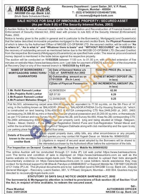 Flat No.503, admeasuring carpet area 834.00 square fts, equivalent to 77.50 sq.mtrs, on the 5th Floor of 'H' wing, in the building known as 'BALADOR'- Phase-I "BALADOR ATHENA Co-Op Housing Society Ltd. "which is constructed on land bearing S.No.455/2B/2 & 457/2A corresponding CTS Nos. 2449,2450 pt, 2451, 2463 ad measuring 24,588.80 sq.mtrs or thereabout as per physical possession and 20,200.00 sq.mtrs. or thereabouts as per 7/12 extract and new Survey No.457, Hissa No.2B, (old Survey No.693, Hissa No.2B) corresponding CTS No.2464 admeasuring 4358.20 sq.mtrs.(as per property card) lying and being situated at Village -Talegaon, Taluka - Maval, District Pune within the Registration District Pune and Sub-Registration Tahasil Maval and within the local limits of Municipal Council of Talegaon Dabhade along with club membership and the open to sky car parking place No. 16 on the ground floor area.