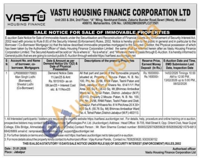 All that part and parcel of the Immovable property situated at Property 1. Mouza Patan, N. B. No. 100, PH. No. 24/56, RNM Patan, Teshil Patan and Distt. Jabalpur, Part of Khasra No. 614/1/1/1 Plot Area 306 Sq.ft. (28.43 Sq. Mt.) Bhimrao Ambedkar Ward No. 4, Tehsil Patan, District Jabalpur (MP) 483113. Property 2 Mouza-Patan, N. B. No. 100, PH. No. 24/56, RNM Patan, Teshill Patan and Distt. Jabalpur, Part of Khasra No. 614 Plot Area 20 X 30-600 Sq.ft. (55.76 Sq. Mt Bhimrao Ambedkar Ward No. 4, Tehsil Patan District-Jabalpur (M.P)-483113