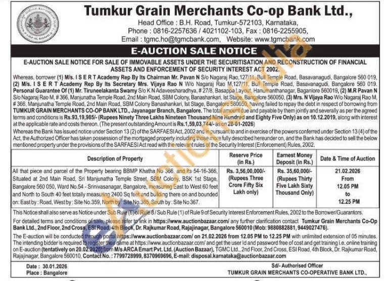 All that piece and parcel of the Property bearing BBMP Khatha No 366, and its 54-16-366, Situated at 2nd Main Road, Sri Manjunatha Temple Street, SBM Colony, BSK 1st Stage, Bangalore 560 050, Ward No.54 Srinivasanagar, Bangalore, measuring East to West 60 feet and North to South 40 feet totally measuring 2400 Sq feet and building there on and bounded on: East by: Road, West by: Site No.359, North by: Site No.365, South by: Site No 367