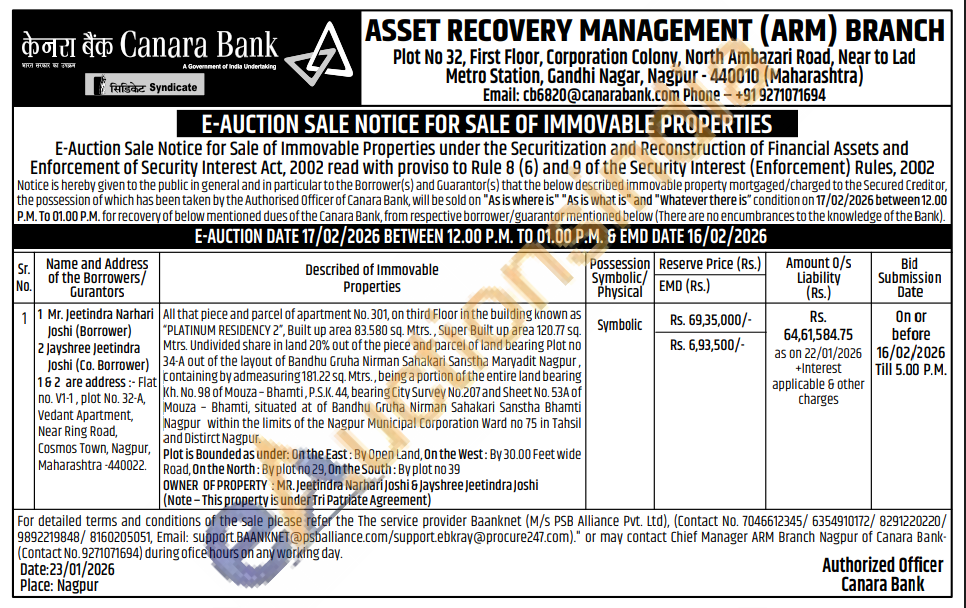 Allthat piece and parcel of apartment No. 301, onthird Floor inthe building known as “PLATINUM RESIDENCY 2”, Built up area 83.580 sq. Mtrs. , Super Built up area 120.77 sq. Mtrs. Undivided share in land 20% out of the piece and parcel of land bearing Plot no 34-A out of the layout of Bandhu Gruha Nirman Sahakari Sanstha Maryadit Nagpur , containing by admeasuring181.22 sq.Mtrs. , being a portion ofthe entire land bearing Kh.No. 98 ofMouza – Bhamti , P.S.K. 44, bearing City Survey No.207 and Sheet No. 53A of Mouza – Bhamti, situated at of Bandhu Gruha Nirman Sahakari Sanstha Bhamti Nagpur within the limits of the Nagpur Municipal Corporation Ward no 75 in Tahsil andDistirct Nagpur. Plot is Bounded as under: On the East : By Open Land, On the West : By30.00 Feet wide Road,On the North :By plot no 29,On the South :By plot no 39 OWNER OF PROPERTY :MR. Jeetindra Narhari Joshi & Jayshree Jeetindra Joshi (Note – This property is underTri Patriate Agreement)