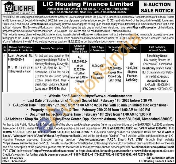 All that part and parcel of the property consisting of Plot No. 8. Harmony Residency, Survey No. 142 & 143, Block No. 121, T. P. Scheme No. 1, Final Plot No. 29 (Old Plot No. 26), Behind Spring Exotica, Bhayli Road, Moje Bhayli, Dist-Vadodara, Gujarat. (Land area=196.96 Sq. Mtr.)