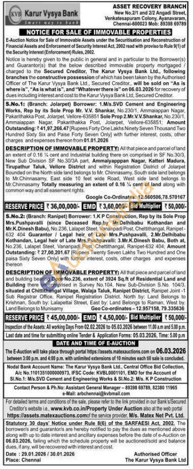 DESCRIPTION OF IMMOVABLE PROPERTY: All that piece and parcel of land an extent of 0.16 1/4 cent and Industrial building there on comprised in SF No.30/3, New Sub Division SF No.30/3A part, Ammalyapppan Nagar, Katteri Madura, Tirupathur Taluk, Vellore District and within Registration District of Jolarpet Bounded on the North side land belongs to Mr. Chinnasamy, South side land belongs to Mr.Chinnasamy, East side 10 feet wide Road, West side land belongs to Mr.Chinnasamy Totally measuring an extent of 0.16 1/4 cent of land along with common way and all easernent rights