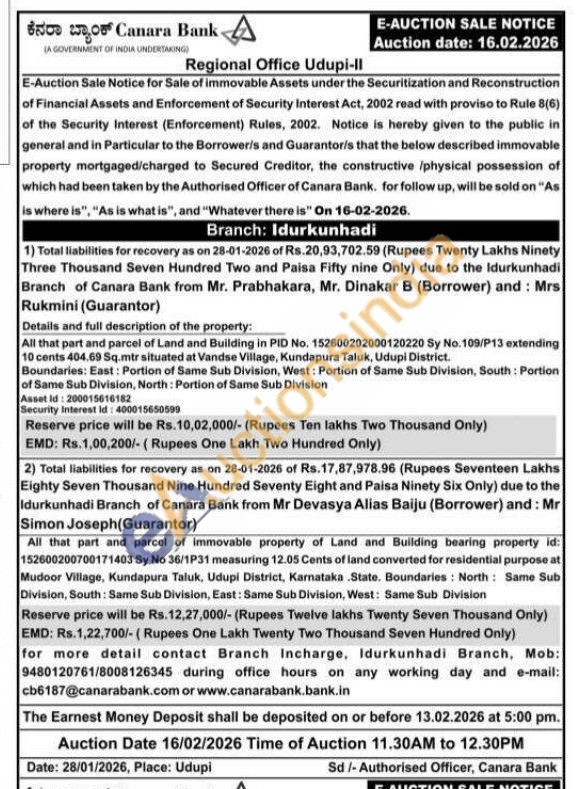 All that part and parcel of immovable property of Land and Building bearing property id: 152600200700171403 Sy No 36/1P31 measuring 12.05 Cents of land converted for residential purpose at Mudoor Village, Kundapura Taluk, Udupi District, Karnataka .State. Boundaries: North: Same Sub Division, South: Same Sub Division, East: Same Sub Division, West: Same Sub Division