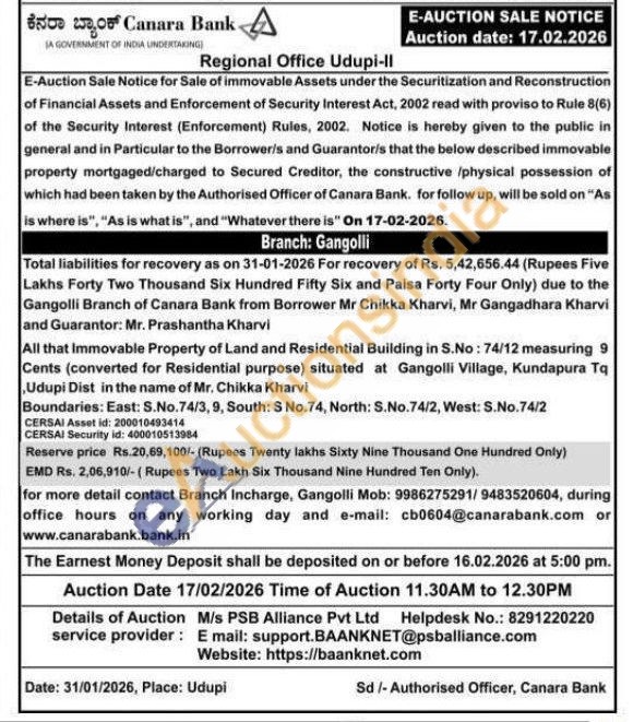 All that Immovable Property of Land and Residential Building in S.No: 74/12 measuring 9 Cents (converted for Residential purpose) situated at Gangolli Village, Kundapura Tq Udupi Dist in the name of Mr. Chikka Kharvi