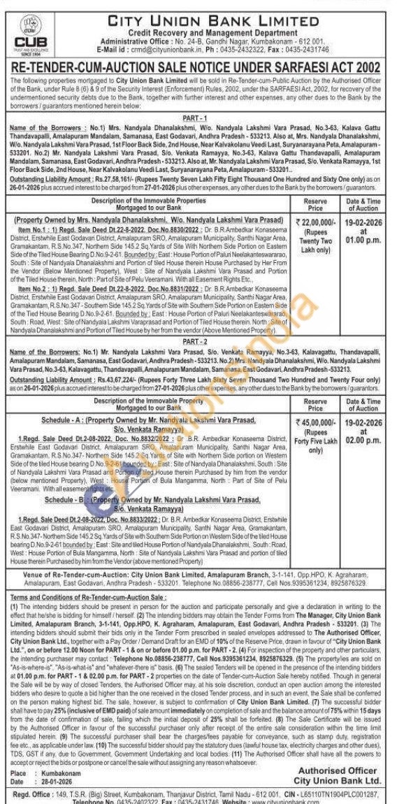 Schedule-A (Property Owned by Mr. Nandyala Lakshmi Vara Prasad, Sio. Venkata Ramayya) 1.Regd. Sale Deed Dt.2-08-2022. Doc. No.8832/2022: Dr BR Ambedkar Konaseena District Erstwhile East Godavar District. Amalapuram SRO, Amalapuram Municipality Santhi Nagar Area, Gramakantam. RS No.347-Northem Sipe 1452 5g Yards of Site with Northern Side portion on Westem Side of the tiled House bearing D.No 9-2-61 bounded by: East: Site of Nandyala Dhanalakshmi, South Ste of Nandyala Lakshmi Vara Prasad and Portion of bled House therein Purchased by him from the vendor (below mentioned Property), West House Portion of Bula Mangamma, North Part of Site of Pelu Veeramani. With all easerment nights inc.