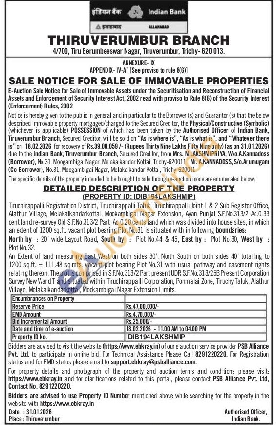 DETAILED DESCRIPTION OF THE PROPERTY (PROPERTY ID: IDIB194LAKSHMIP) : Tiruchirappalli Registration District, Tiruchirappalli Taluk, Tiruchirappalli Joint 1 & 2 Sub Register Office, Alathur Village, Melakalkandarkottai, Mookambigai Nagar Extension, Ayan Punjai S.F.No.313/2 Ac.0.33 cent land re-survey Old S.F.No.313/2 Part Ac 0.20 cents land which was divided into house sites, in which an extent of 1200 sq.ft. vacant plot bearing Plot No.31 is situated with in following boundaries: North by 20' wide Layout Road, South by Plot No.44 & 45, East by Plot No.30, West by: Plot No. 32.