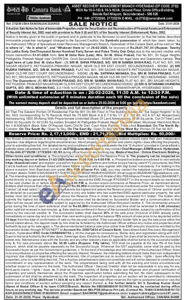 All That The Eastern Portion Of Residential Flat No 801 On 8th Floor In The Building Known As "Sai Sagar Heights" In Sy No. 55/2 Corresponding To Ts Records Ward No 79 899 Block A & E.T.S No 1/1 & 2, 6/2 83, 4/2 & 5/1 &2 Respectively Admeasuring 1500 Sft Along With Proportionate Undivided Share Of Land Admeasuring 38.09 Sq.yards, Out Of Total Land 4800.00 Sq.yards Or 4012.80 Sq.meters Situated At Pattigadda Prakash Nagar Secunderabad, Municipal Ward And Block No 1-8-506/a/b/4 (Back Side Of Razzak Garh) Old Rr Dist. Court Near Railway Track) And Bounded: On The North By: Corridor, On The South By: Open To Sky, On The East By: Open To Sky, On The West By: Portion Of Flat No 801