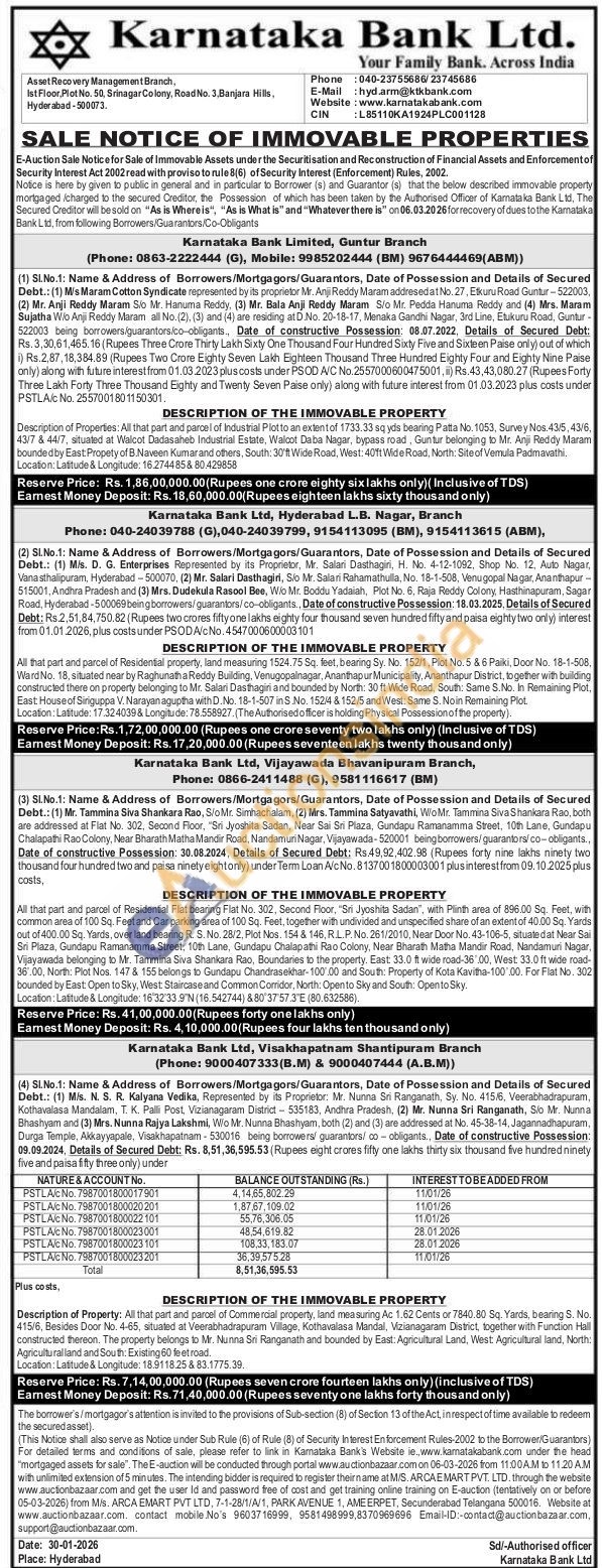 Description of Properties: All that part and parcel of Industrial Plot to an extent of 1733.33 sq yds bearing Patta No. 1053, Survey Nos. 43/5, 43/6, 43/7 & 44/7, situated at Walcot Dadasaheb Industrial Estate, Walcot Daba Nagar, bypass road, Guntur belonging to Mr. Anji Reddy Maram bounded by East: Propety of B.Naveen Kumarand others, South: 30'ft Wide Road, West: 40ft Wide Road, North: Site of Vemula Padmavathi, Location: Latitude & Longitude: 16.2744858 80429858