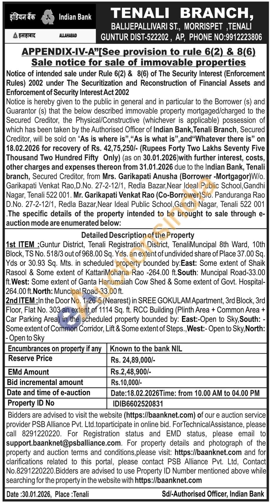 Detailed Description of the Property : 1st ITEM:Guntur District, Tenali Registration District, TenaliMuncipal 8th Ward, 10th Block, TS No. 518/3 out of 968.00 Sq. Yds. an extent of undivided share of Place 37.00 Sq. Yds or 30.93 Sq. Mts. in scheduled property bounded by: East: Some extent of Shaik Rasool & Some extent of KattariMohana Rao -264.00 ft. South: Muncipal Road-33.00 ft. West: Some extent of Ganta Hanumaiah Cow Shed & Some extent of Govt. Hospital-264.00 ft. North: Muncipal Road-33.00 ft.