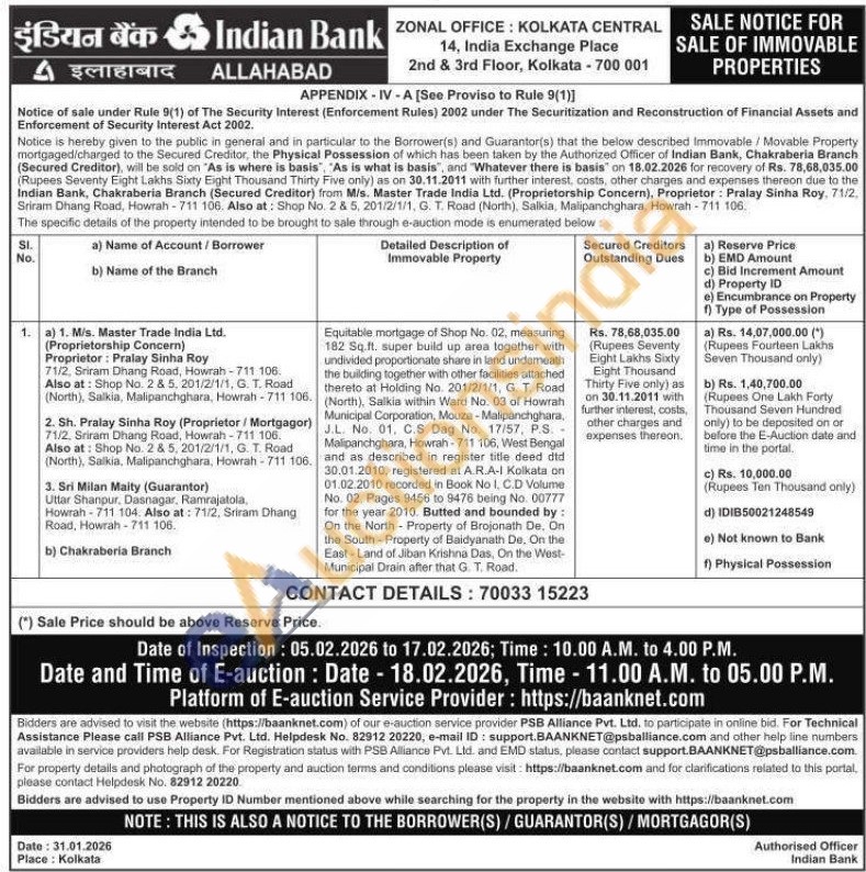 Equitable mortgage of Shop No. 02, measuring 182 Sq. ft. super build up area together with undivided proportionate share in land undemeath the building together with other facilities attached thereto at Holding No. 201/2/1/1, G. T. Road (North), Salkia within Ward No. 03 of Howrah Municipal Corporation, Mouza-Malipanchghara, J.L. No. 01. C.S Dag No. 17/57, P.S. Malipanchghara, Howrah-711 106, West Bengal and as described in register title deed did 30.01.2010, registered at A.R.A-I Kolkata on 01.02.2010 recorded in Book No I, C.D Volume No. 02. Pages 9456 to 9478 being No. 00777 for the year 2010. Butted and bounded by: