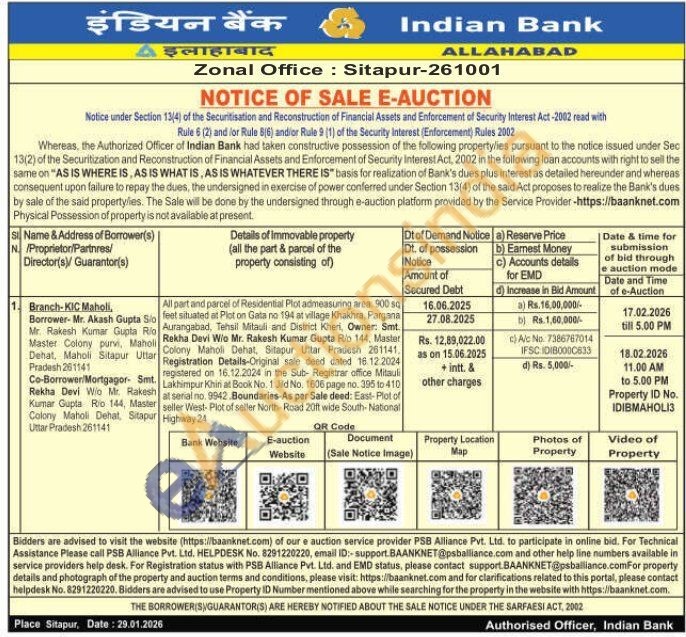 All part and parcel of Residential Plot admeasuring area: 900 50 feet situated at Plot on Gata no 194 at village Khakhra, Pargana Aurangabad, Tehsil Mitauli and District Kheri, Owner: Smt. Rekha Devi W/o Mr. Rakesh Kumar Gupta Rio 144, Mastar Colony Maholi Dehat, Sitapur Uttar Pradesh 261141. Registration Details-Original sale deed dated 16.12.2024 registered on 16.12.2024 in the Sub-Registrar office Mitauli Lakhimpur Khin at Book No. 1 Jild No. 1606 page no. 395 to 410 at serial no. 9942. Boundaries-As per Sale deed: East-Plot of seller West-Plot of seller North-Road 20ft wide South-National Highway 24