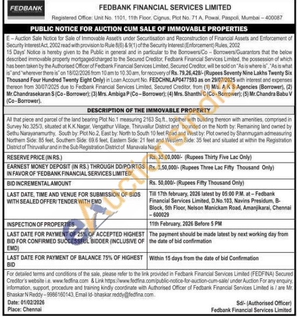 All that piece and parcel of the land bearing Plot No.1 measuring 2163 Sq.ft., together with building thereon with amenities, comprised in Survey No 325/3, situated at K.K. Nagar, Vengathur Village, Thiruvallur District and bounded on the North by. Remaining land owned by Sethu Narayanamurthy, South by: Plot No.2, East by: North to South 10 feet Road and West by: Plot owned by Shanmugam admeasuring Northern Side: 85 feet, Southern Side: 69.6 feet, Eastern Side: 21 feet and Western Side: 35 feet and situated at within the Registration District of Thiruvallur and in the Sub Registration District of Manavala Nagar