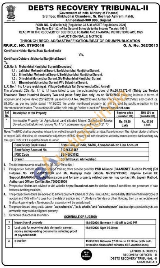 Immovable Property i.e. Agricultural Land situated Mauje: Gadhakada Taluka: Savarkundia Dist: Amreli. Survey No. 173/1, admeasuring area Hector 3.21:73