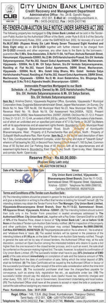 Immovable Properties Mortgaged to our Bank Schedule-A: (Property Owned by Mr. GVS Harishchandra Prasad, S/o. GV. Venkata Satyanarayanarao & Mr. GV Satya Sairam, S/o. GV Venkata Satyanarayanarao) : Item No.1. Krishna District, Vijayawada Registrar Office, Gunadala, Vijayawada F Municipal Corporation Area, Duggirala Balaramakrishnaiah Street, Jageer Machavaram, Un-Survey. Dry Block No. 14. New TSR No.66, Old Municipal Ward No.23, New Municipal Ward No. 278, Revenue Ward No. 16. Block No.19, Old Assessment Nos.2458DA, 19230, Present Assessment No.24582, New Assessment Nos. 200567, 200595, Old Door No 31-12-3 Present D.Nos 31-12-3/1, 31-12-4A, an extent of 845.3/8 Sq. yards or 706.845 Sq.meters of site therein, out of which an undivided and un specified joint share of 47.0 Sq. Yards or 39.297 Sq.Meters with all its appurtenances and all easement rights thereto. Bounded by: East: Municipal Road called as Duggirala Balaramakrishnalah Road, South Property of Kondiparthi Bhavannarayana, West: Property of E.Purnachandra Rao and others, North: Property of Gullapalli Madhusudhana Rao, Ram Kumar, Item No.2: In the above said description of item No.1 Site, Constructed an Apartment Complex, under the name and style of "Vasanth Gokul" where in a Flat bearing No. 302, in Second Floor, having a Plinth Area of 1,160 Sq.feet. Common Area of 50 Sq.feet and Car Parking Area of 60 Sq.feet, with all its appurtenances and all easement rights there to. Bounded by: East: Open to sky, South: Open to sky, West: Staircase and comidor, North: Open to sky