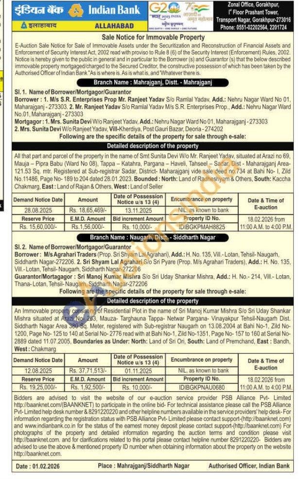 An Immovable property consisting of Residential Plot in the name of Sri Manoj Kumar Mishra S/o Sri Uday Shankar Mishra situated at Arazi No- 263, Mauza- Targhauna Tappa- Netwar Pargana- Vinayakpur Tehsil-Naugarh Dist. Siddharth Nagar Area 380 Sq. Meter, registered with Sub-registrar Naugarh on 13.08.2004 at Bahi No-1, Zild No-1200, Page No- 125 to 140 at Serial No-2776 read with at Bahi No-1, Zild No-1351, Page No-157 to 160 at Serial No-2889 dated 11.07.2005, Boundaries as Under: North: Land of Sri Ori, South: Land of Premchand, East: Bandh, West: Chakmarg