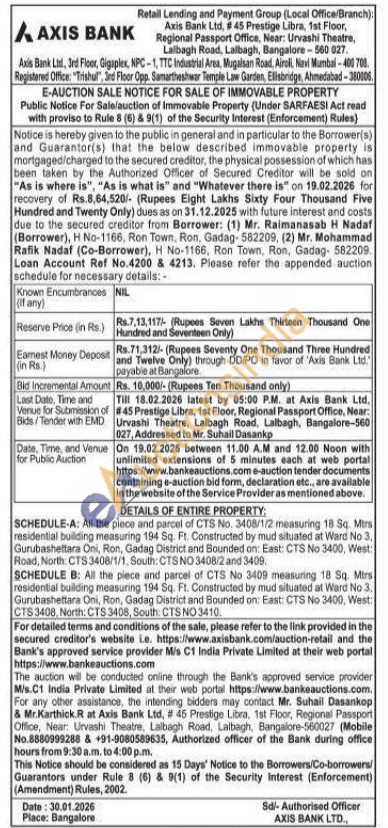 SCHEDULE-A: All the piece and parcel of CTS No. 3408/1/2 measuring 18 Sq. Mtrs residential building measuring 194 Sq. Ft. Constructed by mud situated at Ward No 3, Gurubashettara Oni, Ron, Gadag District and Bounded on: East: CTS No 3400, West: Road, North: CTS 3408/1/1, South: CTS NO 3408/2 and 3409. SCHEDULE B: All the piece and parcel of CTS No 3409 measuring 18 Sq. Mirs residential building measuring 194 Sq. Ft. Constructed by mud situated at Ward No 3, Gurubashettara Oni, Ron, Gadag District and Bounded on: East: CTS No 3400, West: CTS 3408, North: CTS 3408, South: CTS NO 3410.
