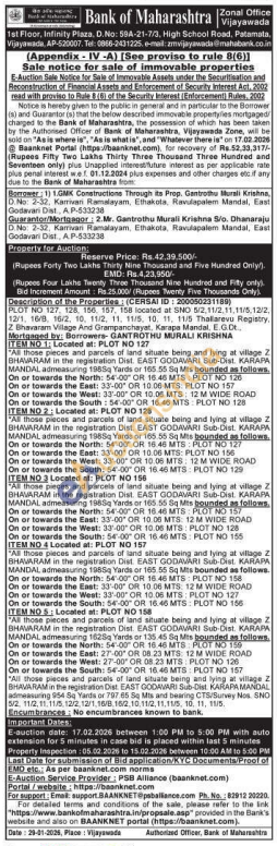 ITEM 3 Located at: PLOT NO 156 All those pieces and parcels of land situate being and lying at village Z BHAVARAM in the registration Dist EAST GODAVARI Sub-Dist KARAPA MANDAL admeasuring 1985q Yards or 160.00 5 Mts pounded as follows On or towards the North: 5400 OR 10:46 MTS: PLOT NO 157 On or towards the East: 33-00°OR 10.00 MTS 12 M WIDE ROAD On or towards the West: 33-00 OR 10.00 MTS PLOT NO 128 On or towards the South: 54-00 OR 16:40 MTS: PLOT NO 155 ITEM NO 4 Located at: PLOT NO 157