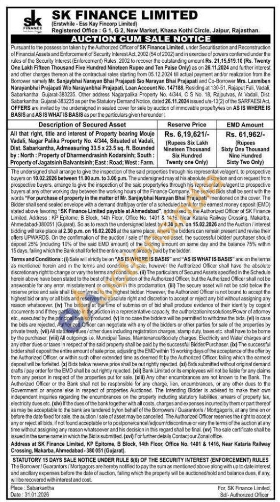 All that right, title and interest of Property bearing Mouje Vadali, Nagar Palika Property No. 4/344, Situated at Vadali, Dist. Sabarkantha, Admeasuring 33.5 x 23.5 sq. ft. Bounded by: North: Property of Dharmendrasinh Kodarsinh; South: Property of Jagatsinh Balvantsinh; East: Road; West: Farm