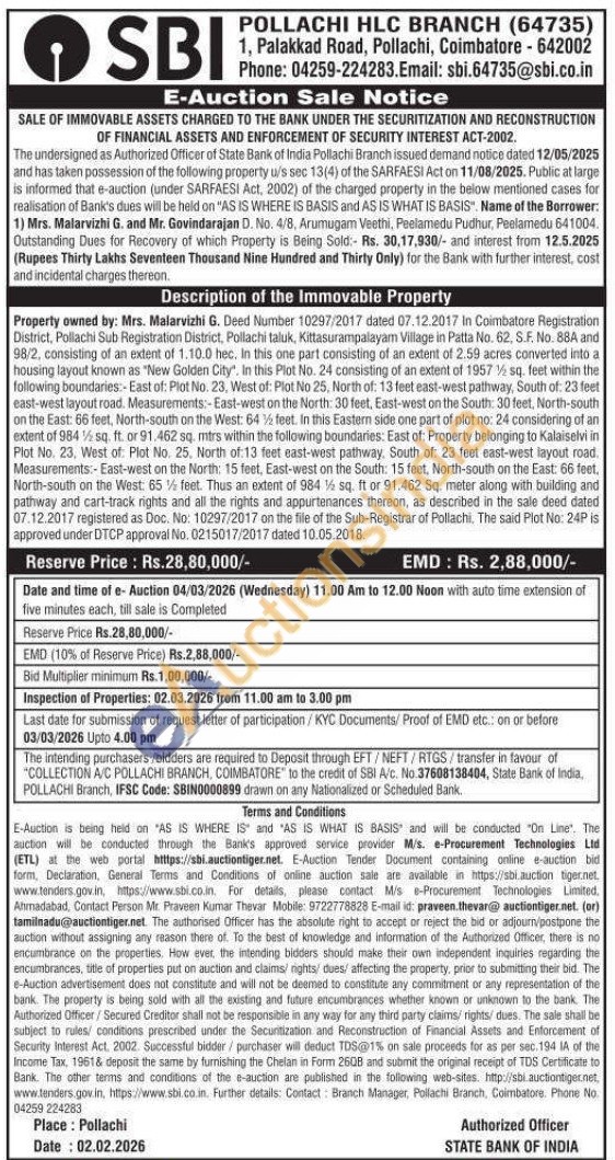 Property owned by: Mrs. Malarvizhi G. Deed Number 10297/2017 dated 07.12.2017 In Coimbatore Registration District, Pollachi Sub Registration District, Pollachi taluk, Kittasurampalayam Village in Patta No. 62. S.F. No. 88A and 98/2, consisting of an extent of 1.10.0 hec. In this one part consisting of an extent of 2.59 acres converted into a housing layout known as "New Golden City". In this Plot No. 24 consisting of an extent of 1957% sq. feet within the following boundaries:- East of: Plot No. 23, West of: Plot No 25, North of: 13 feet east-west pathway, South of: 23 feet east-west layout road. Measurements:-East-west on the North: 30 feet. East-west on the South: 30 feet, North-south on the East: 66 feet, North-south on the West: 64% feet. In this Eastern side one part of plot no: 24 considering of an extent of 984 % sq. ft. or 91.462 sq. mtrs within the following boundaries: East of: Property belonging to Kalaiselvi in Plot No. 23, West of. Plot No. 25, North of: 13 feet east-west pathway, South of: 23 feet east-west layout road. Measurements:-East-west on the North: 15 feet, East-west on the South. 15 feet, North-south on the East: 66 feet, North-south on the West: 65 feet. Thus an extent of 984 % sq. ft or 91.462 Sq. meter along with building and pathway and cart-track rights and all the rights and appurtenances thereon, as described in the sale deed dated 07.12.2017 registered as Doc. No: 10297/2017 on the file of the Sub-Registrar of Pollachi, The said Plot No: 24P is approved under DTCP approval No. 0215017/2017 dated 10.05.2018.