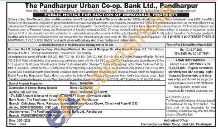Heritage, Fiat No 1, Tilak road, Sadashiv Peth, Pune 411030 Their property All that piece and parcel of Flat No. 103, 303, 503, 703, 104,304,504, 203, 403, 603, 204, 404, 604, 602(2 BHK Flats) and Fiat No. 701 and 702 (3 BHK Flatsi in the building to be constructed on the land bearing S.No. 42 A3/3-2 and 42A3/3-A3 admeasuring about Hectors 00 Are 5.16 valued at Rs. 00 paise 30 and Hectors 00 Are 10.28 valued at Rs. 00 paise 70 Totally admeasuring Hector 00 Are 15.44 ie 1544 Sq. Mtrsze 10620 Sq. Feet as per the 7/12 extract and its corresponding its City Survey No 4778/18 admeasuring at about 1543.67 Sq. Mtrs (As per CTS Extract) alongwith proportionate undivided share in the land under meath said flats, situate at Parvati, within the Registration District Pune Sub Registration Taluka Haveli and within the limits of Pune Municipal Corporation which land is bounded as under: East Salokha Cooperative housing society West. Setokha Cooperative Housing Society South: CTS No. 477/Apart North: 50 Foot OP Road