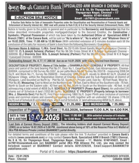 DESCRIPTION OF PROPERTY: Name of Title holder: J SHARMILA DEVI: SCHEDULE 'A' PROPERTY: All that piece and parcel of the land bearing Plot No.51, Door No. 1, Canal Bank Road, East Abiramapuram, Chennai-600004, comprised in Old Survey No.3337, as per patta Block No.66, Survey No.3337/8-measuring 3358.34 Sq.ft. and Block No. 71, Survey No 3568/26-measuring 1286.28 Sq.ft. equals to 4644.62 Sq.ft. situated at Mylapore Village, within the Registration District of Chennai Central and the Sub-Registration of District of Mylapore, Land bounded on North by Plot No.52, South by: Private Land, East by: 40 Feet Road, West by: Plot No.80, Measuring: East to West on the Northern side: 78 feet, East to West on the Southern side: 75 feet, North to South on the Eastern side: 42 feet and 38 feet, North to South on the Western side: 40 feet. In all admeasuring a total extent of 4658 Sq ft. SCHEDULE 'B' PROPERTY (Power Agent Share): An undivided 2/6 shares out of Schedule A land (1552.66 Sq.ft.). SCHEDULE 'C' PROPERTY (Property belongs to borrower Mrs. J. Sharmila Devi) Flat No.F2, First Floor measuring 1860 Sq.ft. Super Plinth area (inclusive of common areas and common shares and covered car parking in stilt) together with an undivided 1/6 shares (776.33 Sq.ft) out of Schedule B undivided share, which out of Schedule 'A' land admeasuring 4658 Sq.ft. above,