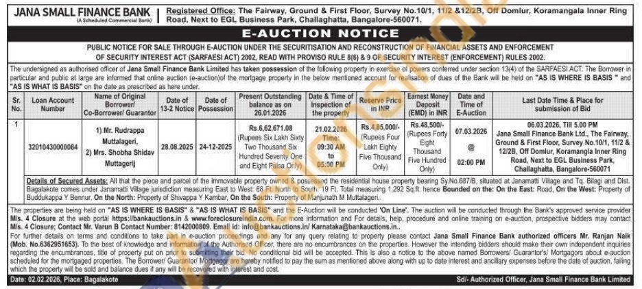 Details of Secured Assets; All that the piece and parcel of the immovable property owned & possessed the residential house property bearing Sy. No.687/8, situated at Janamatti Village and Tq. Bilagi and Dist. Bagalakote comes under Janamatti Village jurisdiction measuring East to West: 68 Ft. North to South: 19 Ft. Total measuring 1,292 Sqft hence Bounded on the: On the East: Road, On the West: Property of Buddukappa Y Bennur. On the North: Property of Shivappa Y Kambar, On the South: Property of Manjunath M Muttalageri.