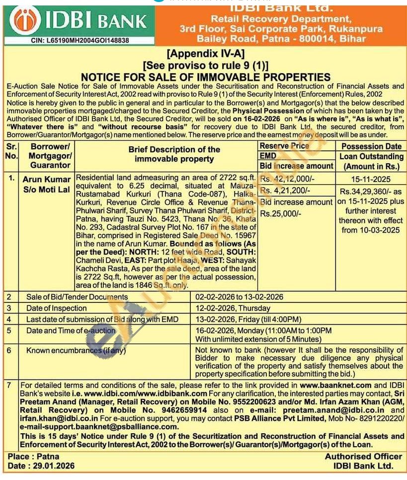 Residential land admeasuring an area of 2722 sq.ft. equivalent to 6.25 decimal, situated at Mauza-Rustamabad Kurkuri (Thana Code-087), Halka-Kurkuri, Revenue Circle Office & Revenue Thana-Phulwari Sharif, Survey Thana Phulwari Sharif, District-Patna, having Tauzi No. 5423, Thana No. 36, Khata No. 293, Cadastral Survey Plot No. 167 in the state of Bihar, comprised in Registered Sale Deed No. 15967 in the name of Arun Kumar. Bounded as follows (As per the Deed): NORTH: 12 feet wide Road, SOUTH: Chameli Devi, EAST: Part plot Haaja, WEST: Sahayak Kachcha Rasta, As per the sale deed, area of the land is 2722 Sq.ft, however as per the actual possession, area of the land is 1846 Sq.ft. only.