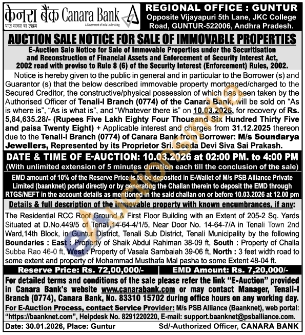 The Residential RCC Roof Ground & First Floor Building with an Extent of 205-2 Sq. Yards Situated at D.No.449/5 of Tenali, 14-64-4/1/5, Near Door No. 14-64-7/A in Tenali Town 2nd Ward, 14th Block, in Guntur District, Tenali Sub District, Tenali Municipality by the following Boundaries: East: Property of Shaik Abdul Rahiman 38-09 ft, South: Property of Challa Subba Rao 46-0 ft, West: Property of Vasala Sambaiah 39-06 ft, North: 3 feet width road to some extent and property of Mohammad Musthafa Mal pasha to some Extent 48-04 ft.