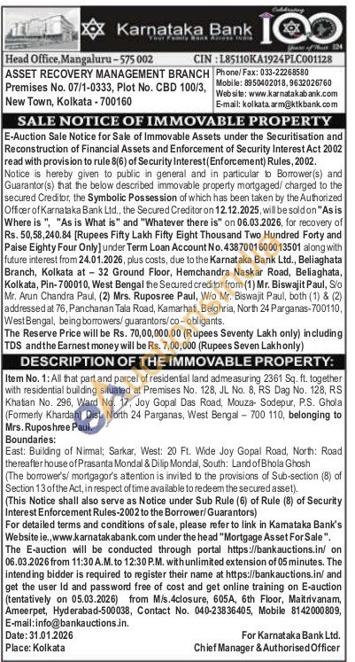 Item No. 1: All that part and parcel of residential land admeasuring 2361 Sq. ft. together with residential building situated at Premises No. 128, JL No. 8, RS Dag No. 128, RS Khatian No. 296, Ward No. 17, Joy Gopal Das Road, Mouza- Sodepur, P.S. Ghola (Formerly Khardah) Dist. North 24 Parganas, West Bengal 700 110, belonging to Mrs. Ruposhree Paul.